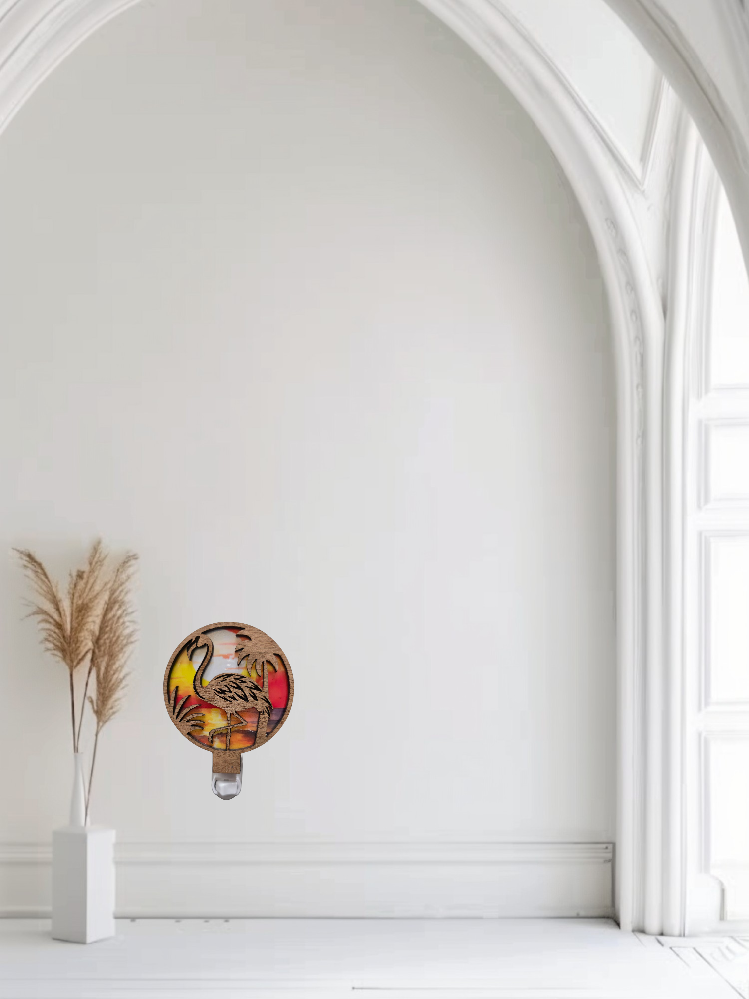Bring a warm, tropical glow to any space with our Flamingo LED Nightlight. This piece is a handcrafted blend of natural wood and vibrant acrylic art. Each light is laser cut and hand assembled in the USA, making every one unique. The acrylic insert inside the wooden frame catches and reflects the soft LED light, creating a beautiful illuminated design that is both playful and elegant.