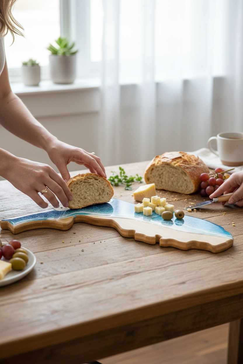Florida-shaped bamboo cutting and serving board featuring a hand-poured ocean resin design. Each piece is truly one-of-a-kind, combining functional kitchenware with stunning coastal art.
