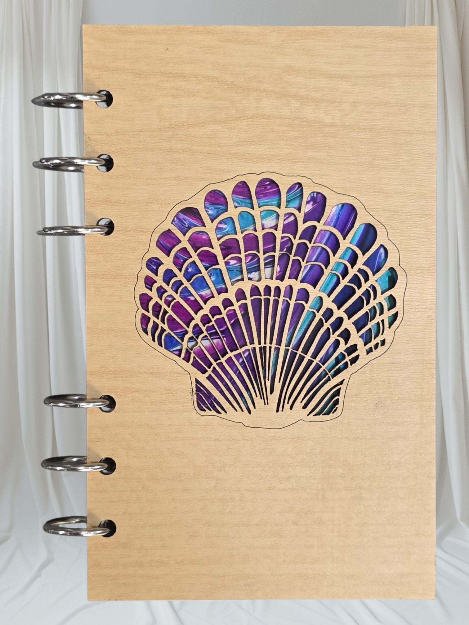 This refillable A6 notebook features a beautifully laser-cut shell design on a natural wood cover, blending coastal inspiration with everyday functionality. The intricate shell cutout reveals subtle color beneath, adding depth and visual interest while keeping the design timeless and elegant.